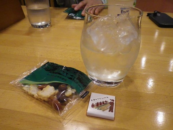 試飲サービスのテーブル。センターにはおつまみセットが乗っているよ。