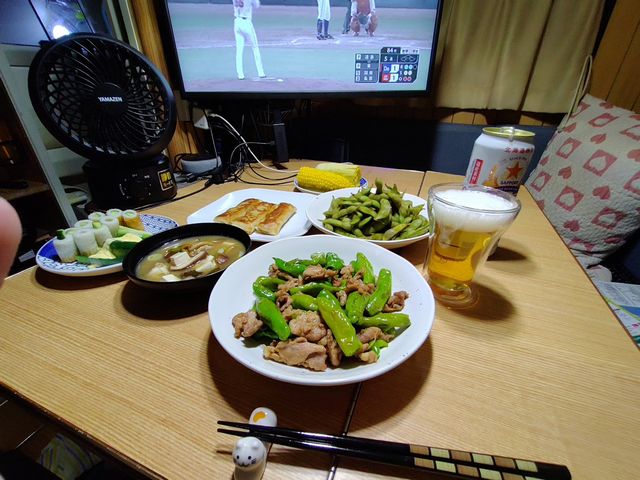 今晩も道の駅などで買った食材で宴会夕飯です。今晩の宴会アテはこんな感じ。メニューは豚肉ししとう炒め、春巻き、黒豆、キノコ汁、竹輪きゅうりなどなど。サッポロクラシックで進める。