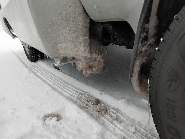 駐車場で排水口部確認。蘭越からニセコまで走ってこのくらい雪が着雪する。あかん。なんかいい方法はないものか。