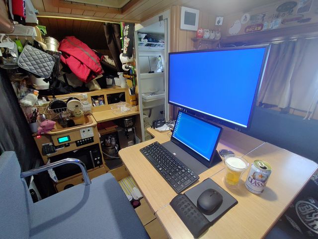 この寒い中バンキャンパーは大丈夫なのかちょっと心配してしまう。こっちはFFヒーターで車内24度で短パンTシャツ。