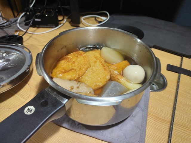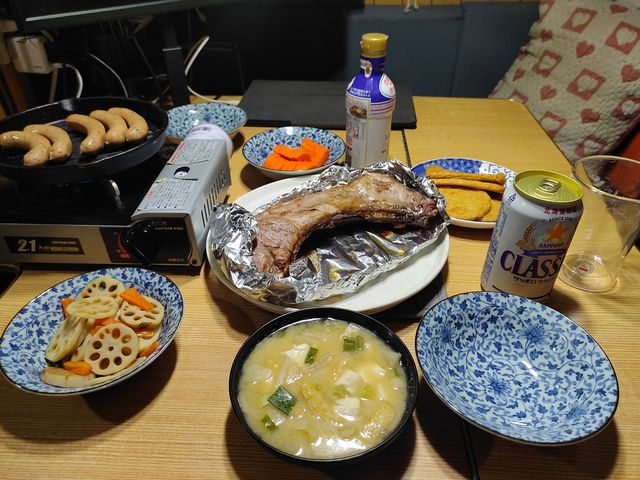 本日の宴会メニュー。マグロカマ、行者ニンニクソーセージ、味噌汁、ぬか漬け、レンコンきんぴら、さつま揚げ。さつま揚げは残ったらおでん鍋にいれる。